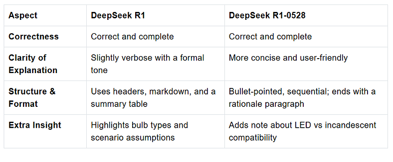 DeepSeek R1 0528 provides a more concise, readable, and efficient answer, where it highlights practical steps and includes a helpful note about bulb type compatibility.